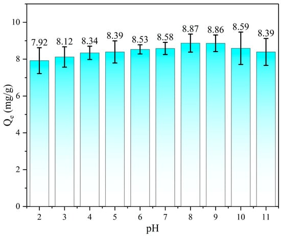 The effect of the initial solution pH on 1,4-D removal was investigated by varying the solution pH from 2 to 11, and the results are presented in Figure 7. As the pH value increased, the removal did not show obvious differences. The reason is 1,4-D is in the ion form at the entire pH range since the pka of 1,4-D is 2.1. Further, the zero charge point of CAs is 7.1 [40]. Therefore, a pH without adjustment (pH = 6.6) is recommended due to the negligible effects of electrostatic attraction to 1,4-D adsorption by CAs.