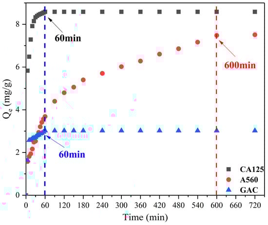 The adsorption of CA125 toward 1,4-D with time is showed in Figure 8. The adsorption performance followed the order of GAC < A560 < CA125. In comparison to A560 and GAC, CA125 exhibited not only a significant increase in adsorption capacity but also a considerably shorter equilibration time. Specifically, the adsorption capacity of CA125 was nearly three times that of GAC, while its equilibration time was only one-sixth of that of A560. Within 30 min, the removal efficiency for 1,4-D reached 66.82%, and complete adsorption equilibrium was achieved within 60 min. Conversely, although A560 demonstrated a higher removal capacity than GAC, it required an extended equilibration time of up to 12 h; on the other hand, GAC showed a shorter equilibration time (60 min) but a relatively lower adsorption capacity.