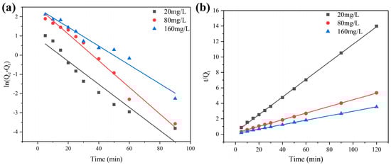 Pseudo-first-order (a) and pseudo-second-order (b) kinetic models for adsorption of 1,4-D on CA125.