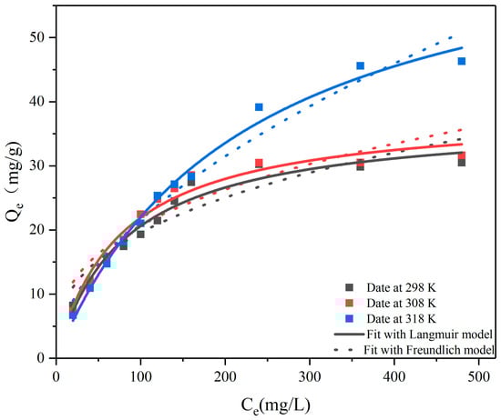 where Qe (mg/g) and Ce (mg/L) were the amounts of adsorbed 1,4-D per unit mass of adsorbent at equilibrium. Qm (mg/g) was the maximum amount of 1,4-D per unit mass of the adsorbent to form a complete monolayer on the surface. Kl (L/mg) was a constant related to the affinity of the binding sites on the adsorbent. Kf (L/mg) and 1/n were the Freundlich model constants, indicating the capacity and intensity of adsorption, respectively.
