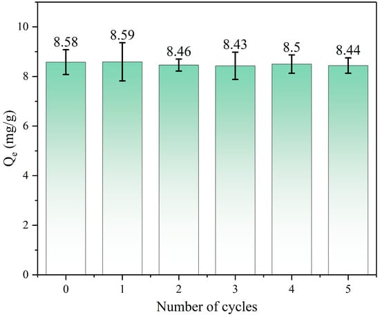 The regeneration performance of adsorbents is one of the important considerations for practical applications. Figure 12 shows the five consecutive adsorption/desorption cycles to remove 1,4-D. The adsorption removal amount was 8.58 mg/g in the first cycle. The adsorption efficacy of the material remains essentially unaltered upon multiple reuses in comparison to its initial adsorption rate. Moreover, when combined with XRD analysis, the configuration of CAs remained essentially unaltered even after repeated utilization. These results showed that the marked retention of the sorption capability is ascribed to the stable structure of CAs. When advantages feature in the CAs’ adsorbent capacity in repeated cycles of 1,4-D, loading and elution are taken into consideration. These results illustrate the facile and high regeneration capability of CAs as a promising adsorbent for 1,4-D.
