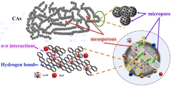 The interactions between the adsorbent and adsorbate involve various forces, such as van der Waals forces, electrostatic attractions, pore filling, π-π electron donor–acceptor interactions, hydrogen bonding, coordination adsorption, and hydrophobic interactions [44,45]. The adsorption mechanism of 1,4-D caused by CAs is depicted in Figure 13. A specific description for this process is as follows: