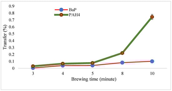 The transfer of PAH4 from tea leaves to tea infusions was found to be time dependent. After 3 min of steeping, the transfer percentage of PAH4 in the tea infusion was determined to be 0.004%. This value increased to 0.04% after 4 min of steeping, indicating a higher transfer rate. Subsequently, at 5 min, the transfer percentage slightly increased to 0.04%, demonstrating a continued transfer of PAH4. After 8 min, the concentration of PAH4 in the tea infusion reached 0.08%, signifying a significant increase in transfer. Finally, at 10 min, the concentration rose to 0.10%, representing the highest observed transfer of BaP (Figure 1).