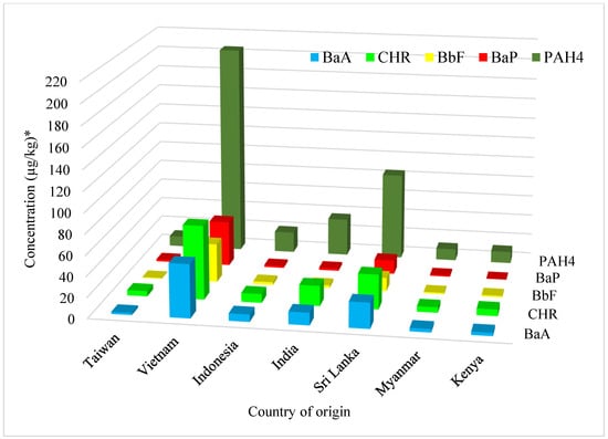 Table 3 shows that the concentration of PAH4 in black tea leaves ranged from 2.88 µg/kg to 218.21 µg/kg. Among the black teas from all seven countries, those from Vietnam had the highest concentration of BaA, CHR, BbF and BaP in dry teas, with mean concentrations of 51.85 µg/kg, 71.95 µg/kg, 37.73 µg/kg and 44.19 µg/kg, respectively. The value of PAH4 in Vietnamese tea ranged from 193.25 µg/kg to 218.21 µg/kg, with a mean content of 205.73 µg/kg. The teas with the second highest concentration were the teas which originated from Sri Lanka. The content of PAH4 in Sri Lankan teas ranged from 63.63 µg/kg to 97.81 µg/kg, with a mean of 85.00 µg/kg. The average concentrations of BaA, CHR, BbF and BaP were 24.88 µg/kg, 33.63 µg/kg, 13.05, and 13.44 µg/kg, respectively. The lowest concentration of PAH4 was determined in teas which originated in Taiwan. The sum of all four PAHs ranged from 2.88 µg/kg to 40.76 µg/kg, with a mean sum of 10.12 µg/kg. The means of BaA, CHR, BbF and BaP were 2.06 µg/kg, 5.20 µg/kg, 0.66 µg/kg, and 2.10 µg/kg, respectively. BbF was not detected in many of the Taiwanese tea samples (Table 3 and Figure 2).