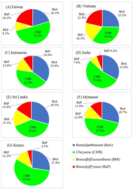Average distribution of BaA, CHR, BbF and BaP in black tea leaves of different countries of origin. (A) Taiwan, (B) Vietnam, (C) Indonesia, (D) India, (E) Sri Lanka, (F) Myanmar, (G) Kenya.