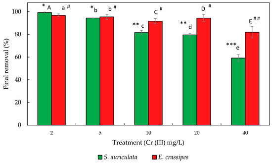 Final removal at different Cr(III) concentrations for each plant. Each value is the mean of the five replicates, and the bars represent standard deviations. Uppercase and lowercase letters indicate significant differences between species for each treatment obtained using Student’s t-test (p < 0.05). The symbols correspond to the ANOVA and the homogeneous subsets, where the asterisk (*) corresponds to S. auriculata and the pound (#) to E. crassipes (p < 0.05). More than one asterisk or pound sign indicates significant differences between treatment subgroups for each species.
