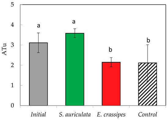 To calculate the LC50, the D. magna that showed total immobility observed under the microscope (10×) was counted after 48 h of exposure to the treatments. The acute toxicity assay on D. magna showed a reduction of 0.96 ATu (p < 0.05) for neonates exposed to an E. crassipes-treated effluent (2.15 ± 0.23 ATu) compared to the initial effluent (3.11 ± 0.49) (Figure 4). The effluent treated with S. auriculata did not produce a reduction in acute toxicity (3.58 ± 0.22 ATu). De Nicola et al. compared the toxicity of untreated wastewater from a traditional tannery (TTE) and a chromium tannery (CTE) on D. magna and found that CTE produced higher toxic effects close to 50% at dilutions of 3.2%, and 100% immobilization at dilutions of 12.5% [40]. The acute toxicity measured in our study is lower than has been reported by other researchers. One possible explanation might be related to the fact that we are dealing with primary effluents and not untreated effluents, which results in lower starting concentrations of toxicants and a high BOD/COD ratio.
