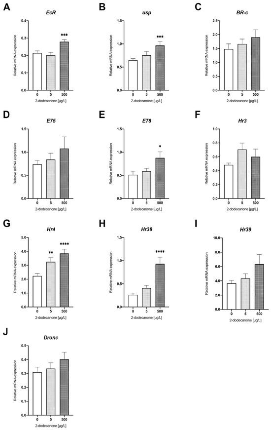 Figure 2. Changes in expression of genes related to ecdysone response pathway in N. vitripennis red pupae exposed to 5 µg/L and 500 µg/L 2-Dodecanone for 48 h. Bars represent the expression patterns of the studied genes measured by real-time RT-PCR ± SE: (A) EcR; (B) usp; (C) Br-c; (D) E75; (E) E78; (F) Hr3; (G) Hr4; (H) Hr38; (I) Hr39; and (J) Dronc. For each experimental condition, three independent experiments were performed, and RNA was extracted from groups of 5 pupae (n = 15). Significant differences with respect to control (Mann–Whitney test): * p < 0.1, ** p < 0.05, *** p < 0.01, and **** p < 0.001.