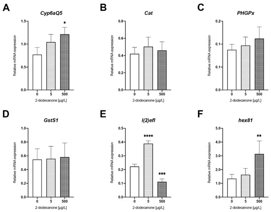 Figure 3. Changes in expression of genes related to biotransformation processes and homeostasis in N. vitripennis red pupae exposed to 5 µg/L and 500 µg/L 2-Dodecanone for 48 h. Bars represent the expression patterns of the studied genes measured by real-time RT-PCR ± SE: (A) Cyp6aQ5; (B) Cat; (C) PHGPx; (D) GstS1; (E) l(2)efl; and (F) hex81. For each experimental condition, three independent experiments were performed, and RNA was extracted from groups of 5 pupae (n = 15). Significant differences with respect to control (Mann–Whitney test): * p < 0.1, ** p < 0.05, ***p < 0.01, and **** p < 0.001.