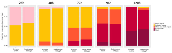 Figure 4. Effects of 2-Dodecanone on pupae development. The proportion of each developmental stage present over time up to 120 h after exposure of white pupae to 0.05% control acetone or 500 µg/L 2-Dodecanone. Each colour represents one developmental stage throughout the whole pupal stage (4 phases) and the adult stage. No significant differences (Anova test; p < 0.05).