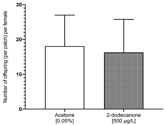 We tested the long-term effect of 2-Dodecanone on the egg-laying host selection behaviour and reproduction of exposed females during their pupal development. The preference of N. vitripennis adult females for either treated or non-treated host fly pupae was evaluated through host-choice bioassays under free-choice conditions. Our results showed that regardless of the female’s treatment during their pupal stage, they chose a patch of host and laid their eggs in a single patch (only 1 out of 84 females laid eggs in two patches). Treatment of females did not affect their choice to lay eggs in a patch of fly host treated or not with 2-Dodecanone (GLM; Likelihood Ratio Chisq2 (2) = 0.25; p = 0.882). Whatever the treatment they previously received, females did not prefer to lay eggs in control fly pupae or those treated with 2-Dodecanone (binomial test; p = 0.11). They laid the same number of offspring in the host patches in both conditions (Figure 5) (Mann–Whitney; W= 847.5; p = 0.259).