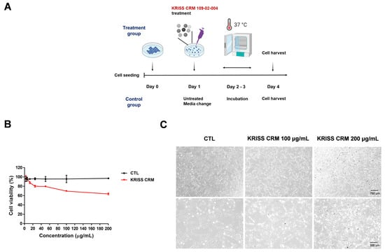 KRISS CRM induced cytotoxicity in BEAS-2B cells. (A) The schematic diagram of PM treatment experiment. Cells were incubated with 100 to 200 μg/mL KRISS CRM after 24 h of cell seeding. KRISS CRM for the indicated days, while control groups were untreated for the following 3 days. (B) Cell proliferation assay was measured using CellTiter 96® Aqueous (Promega, Madison, WI, USA) on day 3 after PM treatment. (C) Cell morphology after 48 h of KRISS CRM treatment (scale bar: 750 μm and 300 μm).
