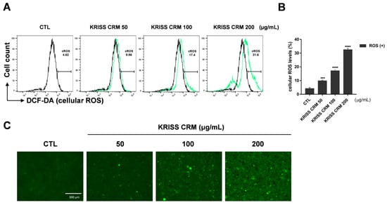 BEAS-2B cells were treated with KRISS CRM for 48 h after being seeded in 6-well plates at a density of 2 × 105 cells per well to measure reactive oxygen species. Intracellular ROS levels were measured using 2’, 7’-dichlorodihydrofluorescein diacetate acetyl ester (H2DCFDA) (Thermo Fisher Scientific, Waltham, MA, USA). The cells were incubated with H2DCFDA (1 µM) at room temperature for 40 min, then washed with phosphate buffer saline (PBS). Cells were suspended in FACS buffer (PBS supplemented with 1% PBS). Then, the intracellular ROS were examined using a flow cytometer (BD FACSVerse, BD Biosciences, San Jose, CA, USA) at an excitation wavelength of 500 nm. Each sample underwent the acquisition of 10,000 events, and the raw geometric mean fluorescence data were analyzed quantitatively using Flowjo software (Version 10, TreeStar, Ashland, OR, USA). Relative fluorescence was determined by normalizing to the control group.