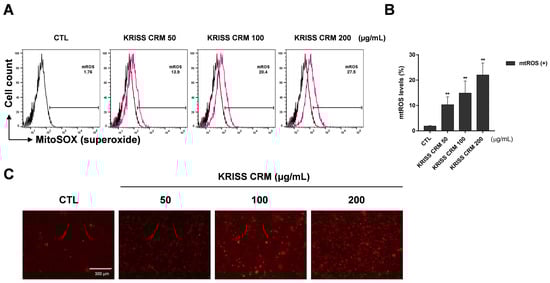 As the transition between oxidative stress and redox signaling is closely linked, we investigated the precise site of ROS generation, whether from cytosolic or mitochondrial production. We assessed the mitochondrial ROS levels using the specific probe for mitochondrial superoxide production, mitochondria-targeted triphenylphosphonium-linked hydroethidium (MitoSOX). For the flow cytometry analysis, we used the 5 μM working solution of MitoSOX with 0.5 M phosphate buffer at pH 7.4. As shown in Figure 3A,B, the KRISS CRM-treated groups increased mitochondrial superoxide anion levels in a dose-dependent manner. As shown in the microscopic analysis in Figure 3C, the intensity of RFP increased gradually in a dose-dependent manner. In the sample group, 50 μg, 100 μg, and 200 μg of KRISS CRM were treated for 48 h and harvested along with the untreated group (control). In the control group, superoxide levels were 1.76%, but after linear dose treatment with KRISS CRM, levels increased to 27.5%. We also checked the increased levels of superoxide using a fluorescence microscope.