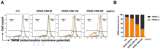 To evaluate the mitochondrial membrane potential, the BEAS-2B cells were plated in 6-well plates at a density of 2 × 105 cells per well. Then, the KRISS CRM was treated after 24 h, and cells were incubated for 48 h. The cells were then harvested and washed twice with cold PBS (Corning, Manassas, VA, USA). After that, cells were incubated with 100 nM TMRM (Thermo Fisher Scientific, Waltham, MA, USA) at 37 °C for 30 min. After incubation, the cells were once again washed, suspended in 2% FBS in PBS, and quantified using a flow cytometer (BD FACSVerse, BD Biosciences, San Jose, CA, USA) at an excitation wavelength of 488 nm. Each sample was processed with the acquisition of 10,000 events, followed by quantitative analysis of the raw geometric mean fluorescence data. Relative fluorescence was determined by normalizing to the control group.