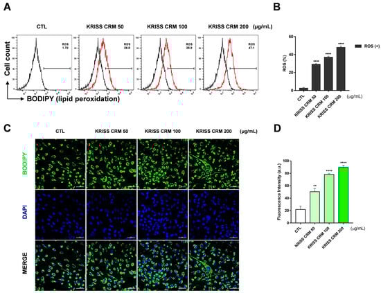 We investigated the effects of KRISS CRM on lipid ROS generation using flow cytometry analysis with C11-BODIPY staining. The results indicated an increase in lipid peroxidation levels in BEAS-2B cells treated with concentrations of 50, 100, and 200 μg/mL of KRISS CRM, as shown in Figure 5. C11-BODIPY is a lipid peroxidation sensor, and the levels were increased to 28.5% at 50 μg, 35.9% at 100 μg, and 47.1% at 200 μg compared to the control value of 1.70%. Flow cytometry analysis confirmed that treatment with KRISS CRM significantly generated the lipid ROS levels in a dose-dependent manner, compared with untreated BEAS-2B cells as shown in Figure 5A,B. To determine the level of lipid peroxidation more visually, we used the lipid peroxidation fluorescence sensor C11-BODIPY for live cell image analysis (Figure 5C,D). The lipophilic fluorescent dye remains bound to the membrane, reacts with various ROS, and undergoes oxidation that shifts the emission peak from approximately 590 nm (red) to approximately 510 nm (green). Cells treated with KRISS CRM exhibited significantly greater emission of oxidized green fluorescence compared to untreated cells. These results show that KRISS CRM induces lipid ROS in human lung epithelial cells.