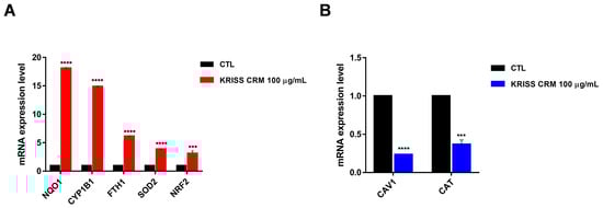 KRISS CRM affects mRNA expression levels of oxidative-stress-related genes. (A) Quantification of mRNA levels of NQO1, CYP1B1, FTH1, SOD2, and NRF was performed by RT-qPCR analysis. Statistical significance is indicated as: *** p < 0.001, **** p ≤ 0.0001. (B) Quantification of mRNA levels of CAV1 and CAT was performed by RT-qPCR. Statistical significance is indicated as: *** p < 0.001, **** p ≤ 0.0001.