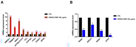 Interestingly, xCT/SLC7A11, SL7A11-AS1, TRIM16L, TRIM16, HMOX1, NQO1, FTL, CYP1B1, and one of the downregulated genes (RGS4) were known to be associated with the oxidative-stress-mediated ferroptosis pathway. Primers were designed to amplify several ferroptosis-related genes including xCT/SLC7A11, TRIM16, FTL, GPX4, CHAC1, and RGS4, which are known ferroptosis regulators. RT-qPCR data showed that there was a significant increase in the mRNA levels of xCT/SLC7A11, TRIM16, FTL, FTH1, CYP1B1, NQO1, HO-1, and GPX4 as shown in Figure 7A, suggesting significant modulation of the ferroptosis-related pathway in human lung epithelial cells. GPX4 (glutathione peroxidase 4), an antioxidant defense enzyme, is a key inhibitor of ferroptosis, which can repair oxidative damage to lipids. In addition, since RGS4 (regulator of G-protein signaling 4) is known to be downregulated during ferroptosis [,], we performed RT-qPCR and showed that RGS4 levels decreased upon the 100 µg of KRISS CRM treatment. As shown in the results, it was confirmed that RGS4, ASCL4, NOX4, and ATF4 levels decreased when treated with KRISS CRM (Figure 7B). On the other hand, nine ferroptosis-related genes were upregulated. According to our research, at the molecular level, KRISS CRM up- or downregulates several gene expressions that undergo ferroptosis.