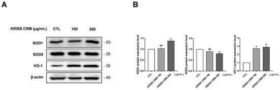The protein expression levels of the antioxidant were confirmed by Western blot assay to find out if KRISS CRM affects the relationship between excessive ROS levels and antioxidants. We measured the expression of superoxide dismutase 1 (SOD1), superoxide dismutase 2 (SOD2), and heme oxygenase (HO-1) by Western blotting after treatment with 100 µg and 200 µg of KRISS CRM. KRISS CRM increased the SOD1 protein expression level and decreased the SOD2 protein expression level in a dose-dependent manner (Figure 8A,B). On the other hand, the expression of HO-1 was significantly increased after treatment with 100 µg and 200 µg KRISS CRM compared to the untreated group. We confirmed that after 48 h of treatment with KRISS CRM, antioxidant biomolecular changes occur. Therefore, excessive ROS levels induced by KRISS CRM can activate the antioxidant defense system.