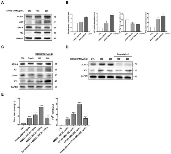 ACSL4 is one of the key genes associated with ferroptosis, regulating this process by altering the composition of cellular membrane lipids. Activation of ACSL4 increases levels of unsaturated fatty acids within cells, which promotes lipid peroxidation and consequently induces ferroptosis [,]. On the other hand, xCT is a cystine-glutamate transporter responsible for exchanging cystine within cells []. This transporter plays a crucial role in providing cysteine for glutachione synthesis, which is essential for alleviating oxidative stress and detoxifying harmful substances within cells [,]. Consequently, impairment of xCT function leads to decreased glutachione levels, exposing cells to oxidative stress and potentially inducing ferroptosis [,]. Thus, xCT serves as a marker for ferroptosis because its activity level reflects the sensitivity of cells to ferroptosis induction. Typically, decreased expression of xCT leads to a reduction in intracellular cystine levels, resulting in diminished glutathione synthesis and rendering cells more vulnerable to oxidative stress and ferroptosis induction [,]. Conversely, reduced GPx-4, a glutathione peroxidase enzyme, results in increased lipid peroxidation in cell membranes, potentially triggering ferroptosis [,]. FTL, known as the ferritin light chain, is part of ferritin, a protein essential for storing and regulating iron. Ferritin prevents iron accumulation in cells and maintains it in a stable state, protecting against oxidative stress and iron toxicity []. Inhibiting FTL reduces ferritin’s ability to store iron in a stable form, increasing the risk of iron toxicity and oxidative stress in cells [,]. Therefore, Figure 9A demonstrates the regulation of ACSL4, xCT, GPx-4, and FTL upon treatment with KRISS CRM, indicating changes in the expression levels of key proteins associated with ferroptosis.