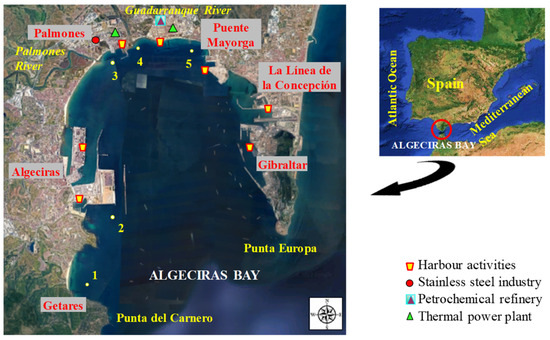 The Bay of Algeciras is an important industrialised area located on the Mediterranean coast of southwestern Spain limited by Punta del Carnero (Algeciras) and Punta Europa (Gibraltar) [23]. This bay covers an area of about 9 × 11 km2, with a maximum depth of almost 400 m [24]. Five cities with more than 275,000 inhabitants are located around the bay (Algeciras: 122,368, Los Barrios: 24,069, La Línea de la Concepción: 63,271, San Roque: 33,018) [25]; Gibraltar: 32,714; total: 275,440 [26]). The bay holds two important ports sited on Algeciras and Gibraltar with intense marine traffic that can cause discharges and accidental spills [27], and also numerous industrial plants distributed along its coastline [24] including stainless steel manufacturing plants, refineries, and petrochemical installations, thermal power plants, ironworks, shipyards, and docks [23,28,29]. Furthermore, urban wastewater discharges may occur due to the high population density of the bay, coming from the main population centres of the cities of Algeciras, Los Barrios, San Roque, La Línea de la Concepción, and Gibraltar. The bay also receives the water discharge from the Guadarranque and Palmones rivers. The water of the bay has a high turnover because of its proximity to the Strait of Gibraltar, where the Mediterranean Sea and the Atlantic Ocean meet with strong currents. These geographical conditions could disperse pollutants in the water [23]. Nevertheless, marine pollution is a realistic risk and a major problem in this area subject to persistent anthropogenic pollution.