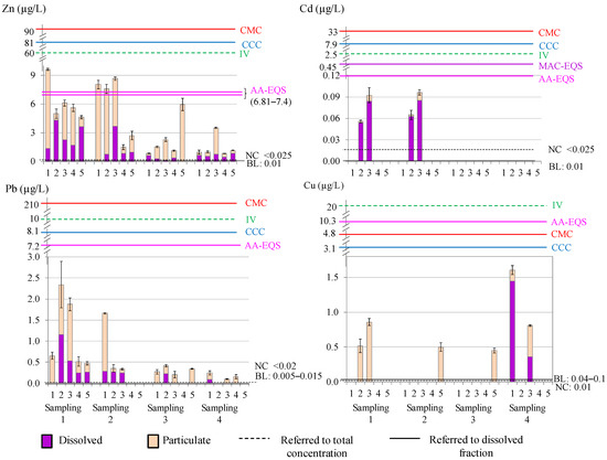 In order to assess the possible impacts on the environment and health, the levels of heavy metals in the waters were compared with reported reference values for coastal and seawaters (Figure 2): (i) background level (BL) referred to the dissolved content [60]; (ii) natural concentration (NC) referred to the total concentration [61]; (iii) imperative values of the Andalusian Government (IV) for the total metal content for limited and non-limited areas (considering the Algeciras Bay as a non-limited area) [42]; (iv) quality guidelines for the protection of aquatic life proposed by the Environmental Protection Agency (EPA) in saltwater [62]—Criteria Maximum Concentration (CMC) for acute contamination and Criteria Continuous Concentration (CCC) for chronic contamination—both referring to the dissolved content; and (v) environmental quality standards presented in the Water Frame Directive (Directive 2000/60/EC of the European Parliament) [63] (AA-EQS for annual average and MAC-EQS for maximum allowable concentration, referred to the dissolved content). Environmental standards for Zn and Cu were calculated as described in the directive. All detected average metal concentrations exceeded the BL and NC values. Higher concentrations were found for Zn in samplings 1 and 2 (sites 1, 2, and 3). For Cd, the concentrations were close to the AA-EQS value. Therefore, it can be stated that the levels of metals found in waters did not compromise the safety of aquatic life in the ecosystem, since concentrations only exceeded the BL and NC values, and most of the limit values were not reached.