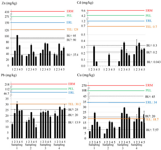 Total metal content and guideline values in sediment. BLa,b,c: background levels proposed by Turekian and Wedepohl [78], OSPAR [79], and Besada et al. [80]; ERM: effects range medium; ERL: effects range low; PEL: probable effect level; TEL: threshold effect level. Note: sites with absence of data were below the LD.