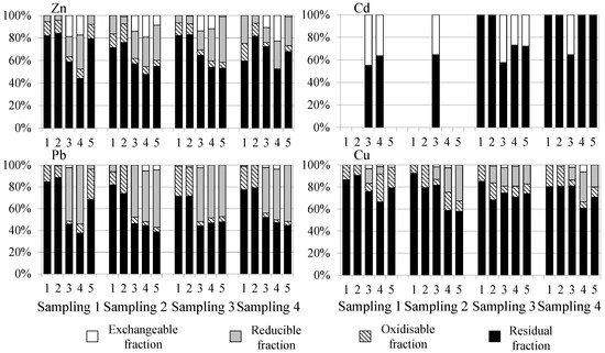The distribution of metals in the sediment (in %) obtained by the BCR sequential extraction procedure is shown in Figure 4.