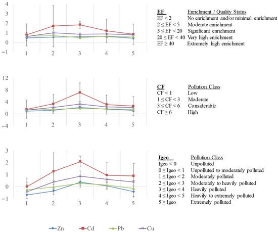 Figure 5 shows these pollution indexes for each metal. All EF values [113] were <2, indicating “no enrichment or minimal enrichment” of these sediments. Nevertheless, values higher than 1 were found for Cd at site 3 (1.86), site 2 (1.55), and site 4 (1.16), suggesting greater enrichment of the sediments by this metal at these sites influenced by urban and industrial activities. Regarding CF values [114], the highest values were again obtained for Cd at site 3 (7.12, “high pollution”, CF ≥ 6), site 2 (3.34), and site 4 (3.09), as well as for Cu at site 3 (3.25), classified as “considerable pollution” (3 ≤ CF < 6). The rest of the values presented “moderate pollution” (1 ≤ CF < 3), being the lower value Zn at site 1 (0.94). Igeo values [112,114] were also higher for Cd at site 3 (2.25, “moderately to heavily polluted”, 2 ≤ Igeo < 3), site 2 (1.15), and site 4 (1.04), and Cu at site 3 (1.11), considered as “moderately polluted” (1 ≤ Igeo < 2). The rest of the values ranged between unpolluted and moderately polluted (Igeo < 1).