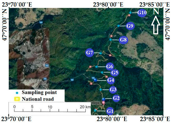 Gutin Pass, Romania, is situated in the central–west part of Maramures, extending from the Gutin Peak (1443 m) to the Baii Mari depression. The mountainous area comprises over 60% of the scope of the studied area, formed by the southern peaks of the Igniș Mountains and the Lăpuș and Gutin Mountains, which are of volcanic origin. The depression area is made up of basins of complex origin. The Baia Mare depression is the most extensive, with an altitude of 200 m, and consists of piedmonts, glaciers, terraces and wide meadows. Ten sampling points (G1–G10) were established for groundwater (spring mountain water) used as a drinking water source in the Gutai Mountains (Figure 1). Twelve sampling campaigns (every month) were organized in 2022. In each campaign, 10 samples were collected, resulting in a total of 120 samples. Procedural standards [25] were followed to perform correct sampling. Samples were directly collected in polyethylene bottles after rinsing with the studied water. Portable equipment was used in-situ for the essential physico-chemical determinations. Duplicates of samples were acidified by adding nitric acid (65% supplied by Merck) until the pH reached 1.0 to 2.0. This prevents precipitation. Water samples were carefully transported and preserved for 24 h until the analysis.