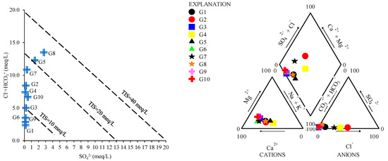 Given the salinity of water, the TIS (Total Ionic Salinity) diagram was used, based on the Cl−, HCO3− and SO42− concentrations and the ratio between them (Figure 2). Generally, groundwater samples have a TIS lower than 40 meq/L. G1, G6 and G9 are characterized by a TIS lower than 10 meq/L, while G5 and G8 are considered to have the highest determined TIS (20 meq/L).