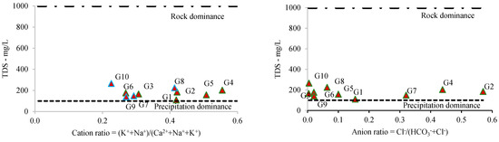 Given the major cation amounts and the ratio between the TDS and cations and anions, the Gibbs plot was applied to establish the dominant source. The Gibbs diagrams indicated that the main ion sources are characterized by rock dominance (Figure 3). Although, the chemistry of G1, based on the plots, may have a precipitation origin.