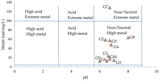 Based on the pH and the metal load (all elements determined in this study—Table 2) in the samples, the Ficklin–Caboi plot was prepared (Figure 4). According to this plot, most of the samples were classified into the near-neutral high metal class, while only the G7 sample was classified into the near-neutral extreme metal class. This indicates that the studied metals present relatively high mobility in the aqueous phase.