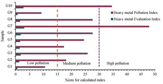 Heavy metal pollution evaluation for samples (G1–G10) according to the pollution indices scores.