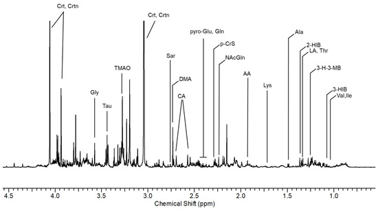 Due to the urine dilution variability, the final concentration of all analytes was normalized to creatinine concentrations, whose diagnostic singlet was integrated at 4.05 ppm. The final concentration of metabolites was expressed as μmol/mmol of creatinine (Supplementary Table S2).