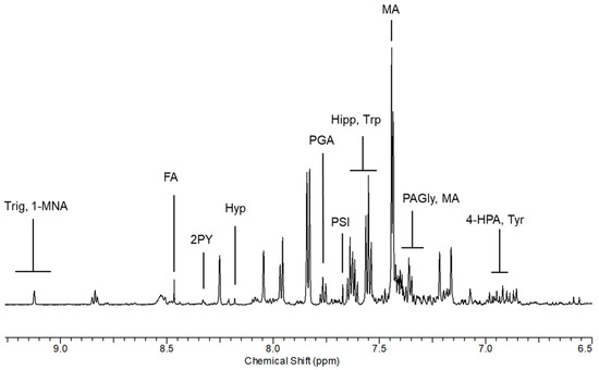 Spectral region of urine between 6.5 and 9.0 ppm from a shipyard worker at the end of the working shift. 1-MNA: 1-methylnicotinamide; 2PY: n-methyl-2-pyridone-5-carboxamide; 4-HPA: 4-hydroxyphenylacetic acid; FA: formic acid; Hipp: hippuric acid; Hyp; hypoxanthine; MA: mandelic acid; PAGly: phenylacetylglycine; PGA: phenylglyoxylic acid; PSI: pseudouridine.