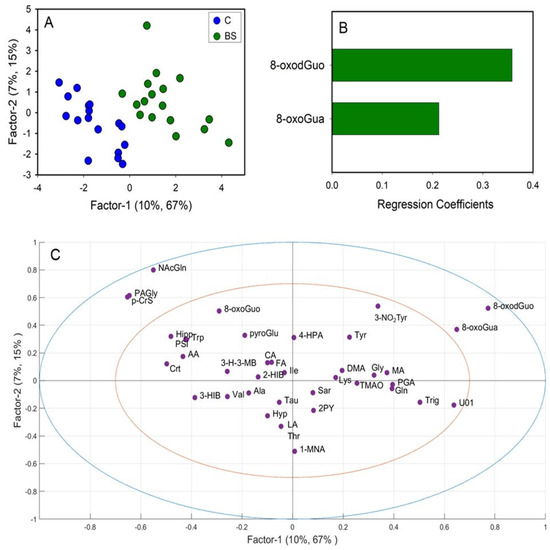 Partial least squares-discriminant analysis (PLS-DA) of integrated datasets of 1H-NMR and HPLC-MS/MS data, comparing controls (C) and workers before their shift (BS). (A) PLS-DA score plot displaying C (blue) and BS workers (green); (B) regression coefficient of the significant variables that discriminate BS (green) from C; (C) loadings plot. 1-MNA: 1-methylnicotinamide; 2-HIB: 2-hydroxyisobutyric acid; 2PY: N-methyl-2-pyridone-5-carboxamide; 3-H-3-MB: 3-hydroxy-3-methylbutyric acid; 3-HIB: 3-hydroxyisobutyric acid; 3-NO2Tyr: 3-nitrotyrosine; 4-HPA: 4-hydroxyphenylacetic acid; 8-oxodGuo: 8-oxo-7,8-dihydro-2′-deoxyguanosine; 8-oxoGua: 8-oxo-7,8-dihydroguanine; 8-oxoGuo: 8-oxo-7,8-dihydroguanosine; AA: acetic acid; Ala: alanine; CA: citric acid; Crt: crea-tine; DMA: dimethylamine; FA: formic acid; Gln: glutamine; Gly: glycine; Hipp: hippuric acid; Hyp; hypoxanthine; Ile: isoleucine; LA: lactic acid; Lys: lysine; MA: mandelic acid; N-AcGln: N-acetylglutamine; PAGly: phenylacetylglycine; p-CrS: p-cresol sulfate; PGA: phenylglyoxylic acid; PSI: pseudouridine; pyroGlu: pyroglutamylglutamic acid; Sar: sarcosine; Tau: taurine; Thr: threonine; TMAO: trimethylamine N-oxide; Trig: trigonelline; Trp: triptophan; Tyr: Tyrosine; U01: unknown 01; Val: valine.