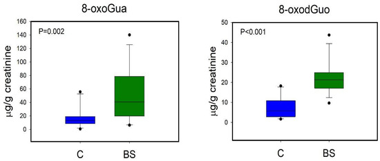 A first PLS-DA was carried out comparing the metabolic profiles of C and BS workers (Figure 3A). The PLS-DA model resulted in two significant latent variables (LV) and showed high robustness with R2 = 0.82 and Q2 = 0.52. Regression coefficient values (Figure 3B) showed that only two variables were important for the discrimination, specifically the levels of 8-oxoGua and 8-oxodGuo, which were higher in BS workers compared to C. Univariate analysis performed by via the Mann–Whitney rank sum test (p < 0.05) confirmed the significant differences in 8-oxoGua and 8-oxodGuo levels, being significantly higher in BS workers than in the controls (Figure 4).