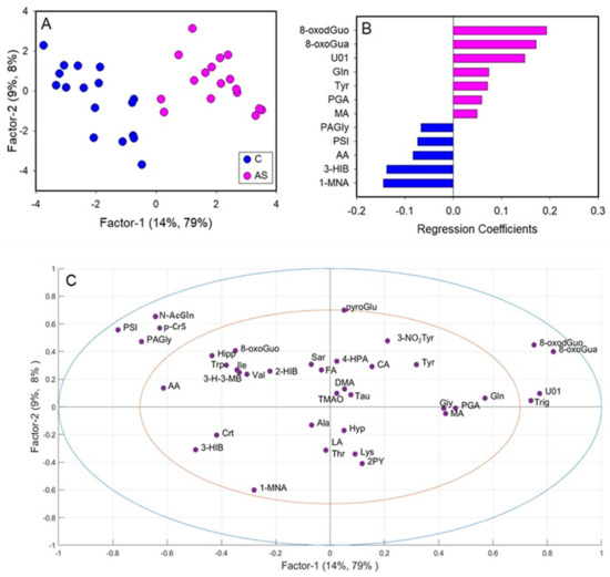 Partial least squares-discriminant analysis (PLS-DA) of integrated datasets of 1H-NMR and HPLC-MS/MS data, comparing controls (C) and workers after their shift (AS). (A) PLS-DA score plot displaying C (blue) and AS workers (magenta); (B) regression coefficient of the significant variables that discriminate BS (magenta) from C; (C) loadings plot. 1-MNA: 1-methylnicotinamide; 2-HIB: 2-hydroxyisobutyric acid; 2PY: N-methyl-2-pyridone-5-carboxamide; 3-H-3-MB: 3-hydroxy-3-methylbutyric acid; 3-hIB: 3-hydroxyisobutyric acid; 3-nO2Tyr: 3-nitrotyrosine; 4-HPA: 4-hydroxyphenylacetic acid; 8-oxodGuo: 8-oxo-7,8-dihydro-2′-deoxyguanosine; 8-oxoGua: 8-oxo-7,8-dihydroguanine; 8-oxoGuo: 8-oxo-7,8-dihydroguanosine; AA: acetic acid; Ala: alanine; CA: citric acid; Crt: creatine; DMA: dimethylamine; FA: formic acid; Gln: glutamine; Gly: glycine; Hipp: hippuric acid; Hyp; hypoxanthine; Ile: isoleucine; LA: lactic acid; Lys: lysine; MA: mandelic acid; N-AcGln: N-acetylglutamine; PAGly: phenylacetylglycine; p-CrS: p-cresol sulfate; PGA: phenylglyoxylic acid; PSI: pseudouridine; pyroGlu: pyroglutamylglutamic acid; Sar: sarcosine; Tau: taurine; Thr: threonine; TMAO: trimethylamine N-oxide; Trig: trigonelline; Trp: triptophan; Tyr: tyrosine; u01: unknown 01; Val: valine.