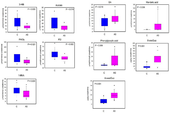 Boxplot of urinary metabolites that showed statistically significant changes between C (controls, blue) and AS workers (after shift, magenta). Statistical significance was assessed via the Mann–Whitney rank sum test. Boxplots report p values, median, minimum and maximum values (black dots), and the 25th and 75th percentile values of metabolites concentrations.