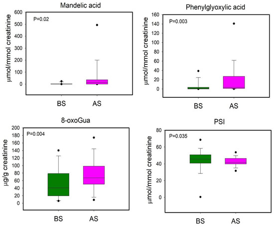As regards the short-term metabolic response to styrene exposure, our results showed increased levels of MA, PGA and 8-oxoGua in AS workers and decreased levels of PSI in respect to the samples taken before the shift. Comparing BS and AS workers, we suggest that these metabolites could define the urinary profile related to the short-term response to styrene exposure. PSI is a post-transcriptional RNA modification and is the most abundant modified nucleoside in RNA [44], and it is excreted in urine without further modifications as the final product of RNA catabolism [45]. Its urinary levels reflect RNA turnover and, indirectly, protein turnover [46,47].