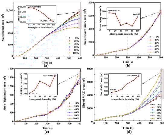 | Atmospheric Humidity/% | Size of Lethal Area/m2 | Size of Severe Injury Area/m2 | Size of Light Injury Area/m2 | Size of MAC Area/m2 | Size of Total Hazardous Area/m2 |