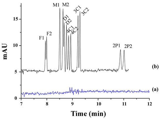 Electropherograms obtained for (a) non-spiked water sample and (b) spiked water sample with the mixture of six phenoxy acid herbicides using 100 mg of PMO-STPA sorbent and a 750 mL sample volume. Spiked concentrations of 3.3 µg L−1 for the six phenoxy acids. Compounds: F: fenoprop (Rs = 1.1), M: mecoprop (Rs = 2.7), D: dichlorprop (Rs = 1.9), 4C: 4-CPPA (Rs = 1.7), 3C: 3-CPPA (Rs = 1.2), 2P: 2-PPA (Rs = 1.6), 1: First-migration enantiomer; 2: Second-migration enantiomer. Experimental conditions: BGE: 50 mM phosphate buffer (pH 7.0) + 20 mM TM-β-CD + 7 HP-β-CD, uncoated fused-silica capillary effective length of 50 µm i.d. × 50 cm, injection by pressure of 50 mbar × 10 s, temperature of 15 °C, applied voltage of +25 kV, and UV detection at 194 nm (2-PPA and 4-CPPA), 200 nm (M, D, and 3-CPPA), and 210 nm (F) (bandwidth 5 nm). Reproduced with permission [].
