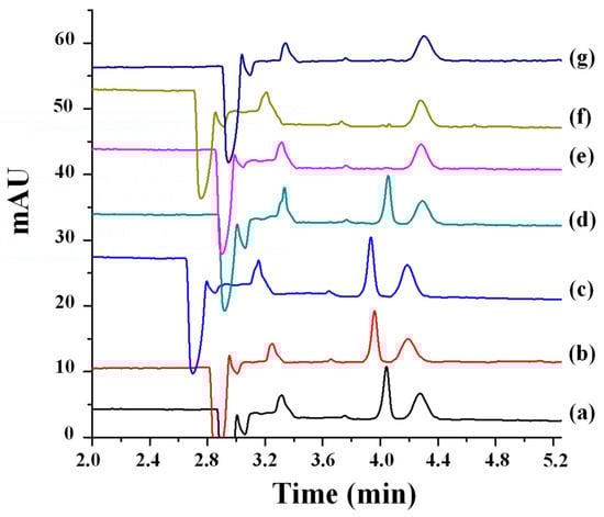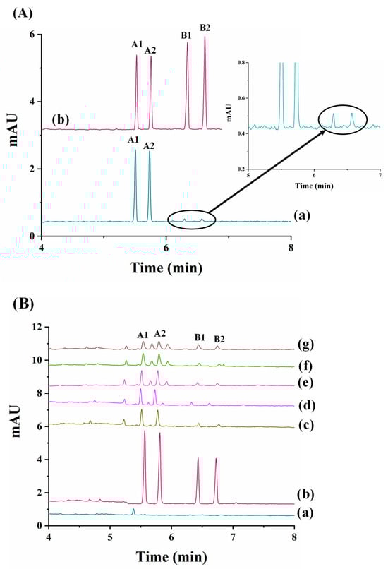 Electropherograms corresponding to: (A) The analysis of a carfentrazone-ethyl-based commercial agrochemical formulation: (a) standard solution containing 30 mg L−1 of carfentrazone-ethyl racemate and 20 mg L−1 of carfentrazone racemate, and (b) commercial herbicide formulation containing 30 mg L−1 of carfentrazone-ethyl racemate according to the label. (B) The analysis of the extracts obtained from soil samples spiked with 40 mg L−1 carfentrazone-ethyl racemate (degradation study of carfentrazone-ethyl in soil samples): (a) soil extract blank; (b) standard solution of carfentrazone-ethyl racemate and carfentrazone racemate at 40 mg L−1 and 20 mg L−1, respectively; (c) soil extract after zero days; (d) soil extract after one day; (e) soil extract after three days; (f) soil extract after four days; and (g) soil extract after seven days. Experimental conditions: BGE: 25 mM sodium acetate buffer (pH of 5.0) + 2.5% (w/v) captisol, uncoated fused-silica capillary with an effective length of 50 µm i.d. × 50 cm, injection by pressure of 50 mbar × 10 s, temperature of 30 °C, applied voltage of −30 kV, and UV detection at 245 ± 4 nm. A1 and A2: carfentrazone-ethyl enantiomers; B1 and B2: carfentrazone enantiomers. Reproduced with permission [].
