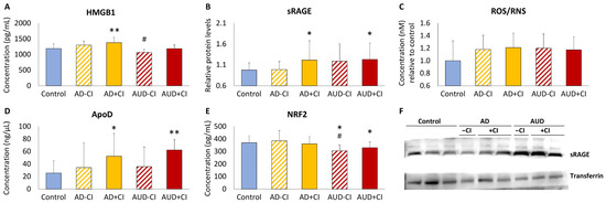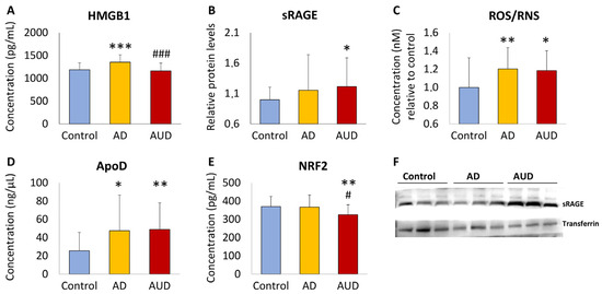 3.2. Cognitive Impairment in AUD Patients Alters Plasma Concentrations of HMGB1, RAGE, ROS/RNS, ApoD, and NRF2 Compared to AD and Control Groups