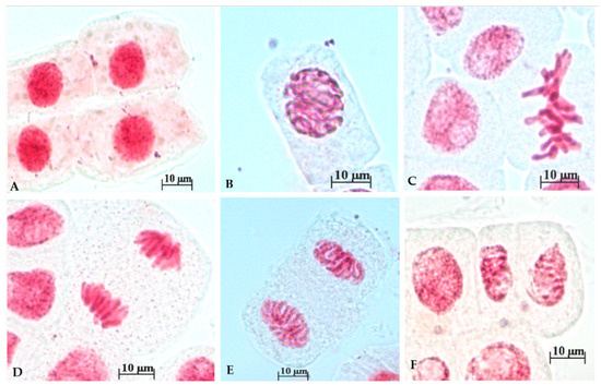 The Feulgen-squash method was used to prepare slides for analyzing root meristematic cells [43,55,57,61,62]. Apical meristems were washed in distilled water and then fixed in Carnoy [glacial acetic acid:ethanol (1:3)]. To observe mitotic stages and chromosomal anomalies, apical meristems were hydrolyzed in 1N HCl at 60 °C for 5 min and stained with 1% aceto-orcein for 15 min. Afterward, the tip of the meristem was placed on a glass slide, covered with a coverslip, and crushed. The slides obtained were analyzed under a microscope to calculate the mitotic index, mitosis inhibition, and chromosomal aberrations. The mitotic activity was analyzed by looking at the morphological changes in the nuclei during cell division and structural chromosomal aberration.