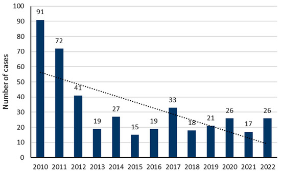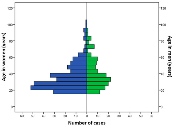During the study period, 425 patients met our inclusion criteria. The average number of cases was 33 ± 23 per year, with a decreasing trend over the years (p = 0.0131; Figure 1). The sex ratio (M/F) was 0.52. The median age was 34 years (IQR: 25–47), but was significantly older in men (36 years; IQR: 27–51) as compared to women (32; IQR: 24–46) (p = 0.014; Figure 2). A history of psychiatric disorders was found in 41.9% of cases. Among patients, 357 (84%) were classified as PSS 1 or 2 and 68 (16%) as PSS 3 or 4. Table 1 shows the patients’ epidemiological data and compares the data for the PSS 1 or 2 and PSS 3 or 4 groups.