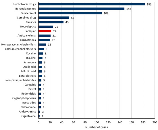 - Aguilón-Leiva, J.J.; Tejada-Garrido, C.I.; Echániz-Serrano, E.; Mir-Ramos, E.; Torres-Pérez, A.M.; Lafuente-Jiménez, A.; Martínez-Soriano, M.; Santolalla-Arnedo, I.; Czapla, M.; Smereka, J.; et al. Clinical and Sociodemographic Profile of Acute Intoxications in an Emergency Department: A Retrospective Cross-Sectional Study. Front. Public Health 2022, 10, 990262. [Google Scholar] [CrossRef]