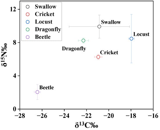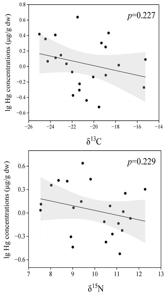 - Wu, X.; Chen, L.; Li, X.; Cao, X.; Zheng, X.; Li, R.; Zhang, J.; Luo, X.; Mai, B. Trophic transfer of methylmercury and brominated flame retardants in adjacent riparian and aquatic food webs: 13C indicates biotransport of contaminants through food webs. Environ. Pollut. 2022, 306, 119433. [Google Scholar] [CrossRef] [PubMed]