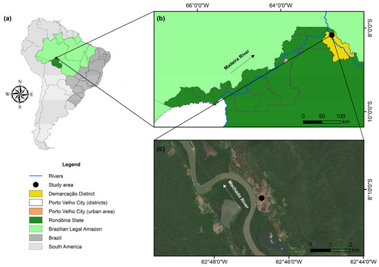A location map of the study area representing (a) South America, Brazil, and the Brazilian “Legal Amazon”, (b) the urban area of Porto Velho, and (c) the Demarcação District.
